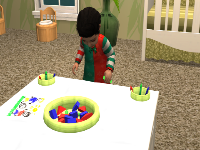 Cetus finally stopped complaining long enough to start playing on the activity table in the nursery. I really love when my sims can do something fun that helps them learn skills as well.